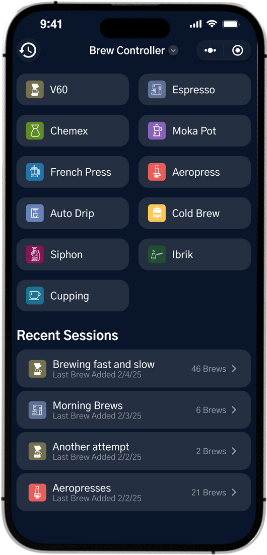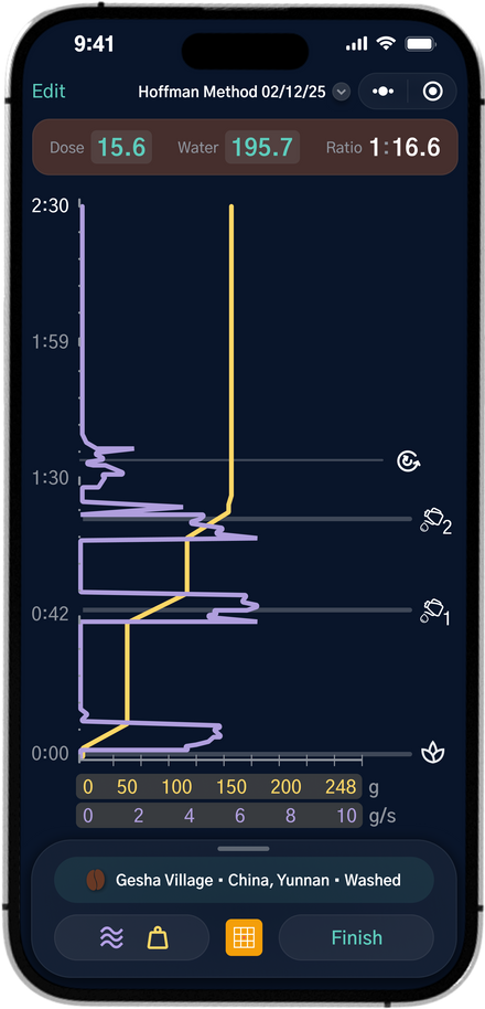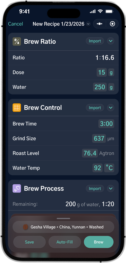 Turn your brew ratio, temp, grind size, roast color, and process into a guided recipe with Brew Recorder to make great cups repeatibly.